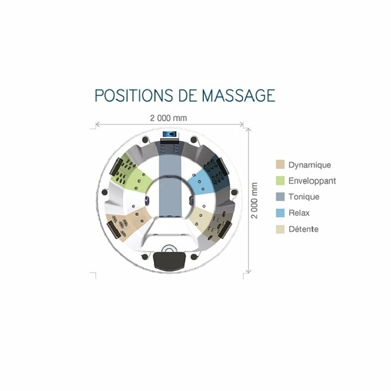 Les 5 positions de massages qui sont : dynamique, enveloppant, tonique, relaxant et détente peuvent être choisis grâce au panneau de commande intégré dans la baignoire.