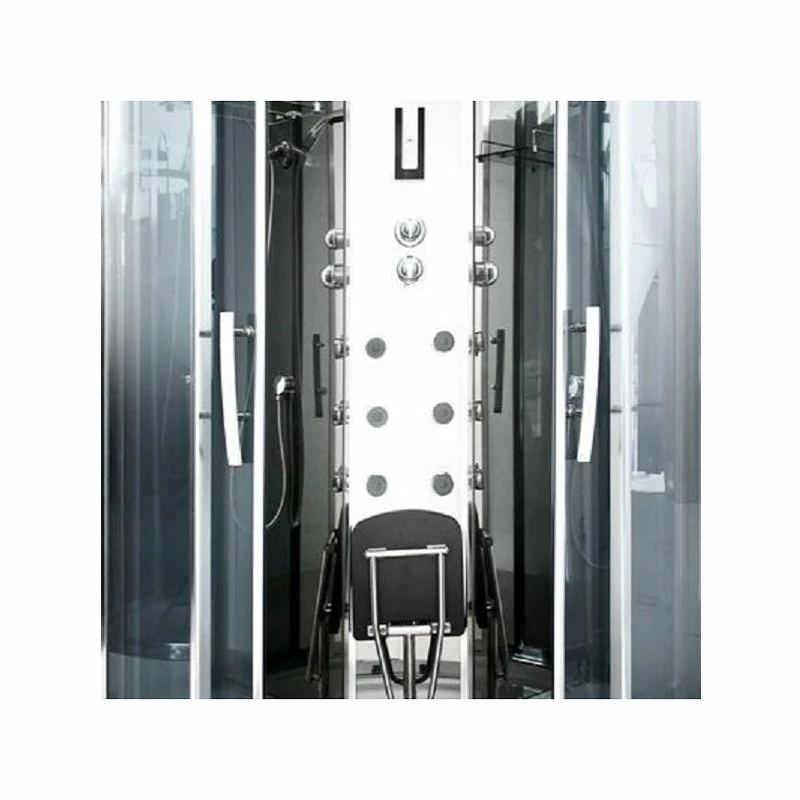 Fournie avec un siège pliant noir et 6 buses de massage, la cabine de douche hydromassante Rio 90 sait vous offrir des moments de douche remarquables, tout en ayant une salle de bain ultra moderne. En plus de ce grand confort, elle vous fait également profiter de sa fonction Radio car elle dispose d’un panneau de commande afin de changer votre musique et de régler votre son.