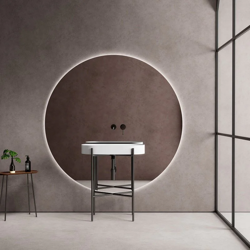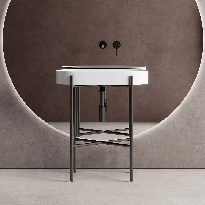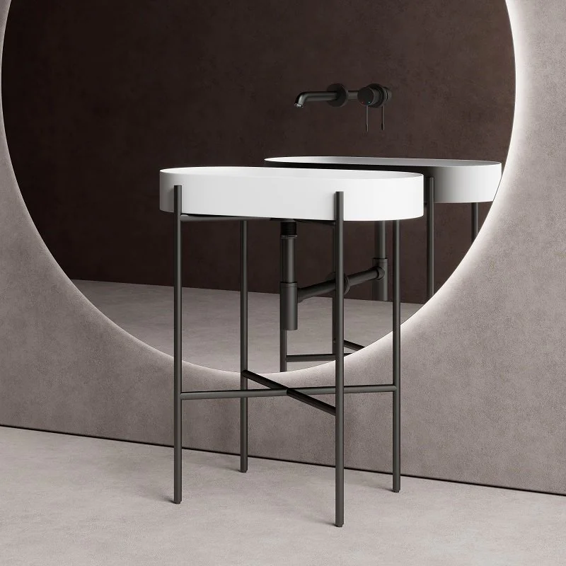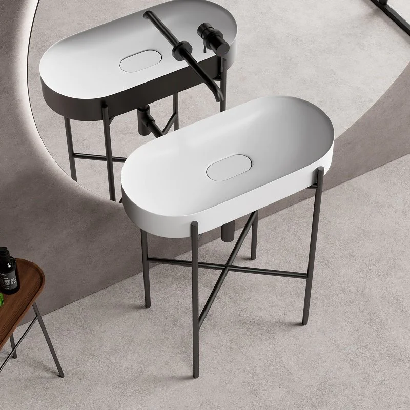 Ce lavabo console ELLE ovale 70cm est composé d’une vasque à poser en résine et de pied “console” en métal noir mat.