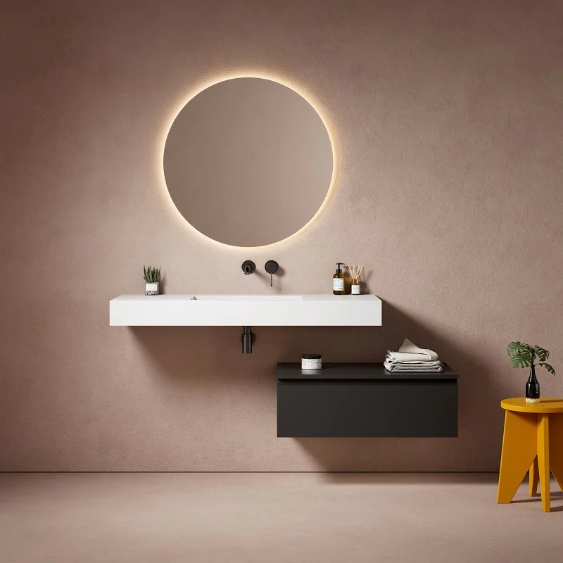 Cet ensemble meuble de salle de bain et vasque est composé d’un plan vasque suspendu SISA 120 cm en solid surface et d’un meuble bas SHEDA 80 cm.
