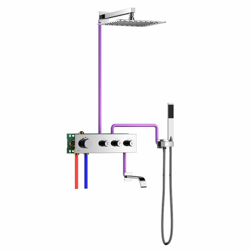 Le kit de douche trois fonctions Quadra est un mélange de classe et de modernité. Voici les éléments qui le composent. Une douchette en laiton chromée rectangulaire, une tête de douche de 30 cm x 30 cm , un bras de douche de 40 cm pour plus de confort sans parler de son bec verseur à la ligne droite et épurée.