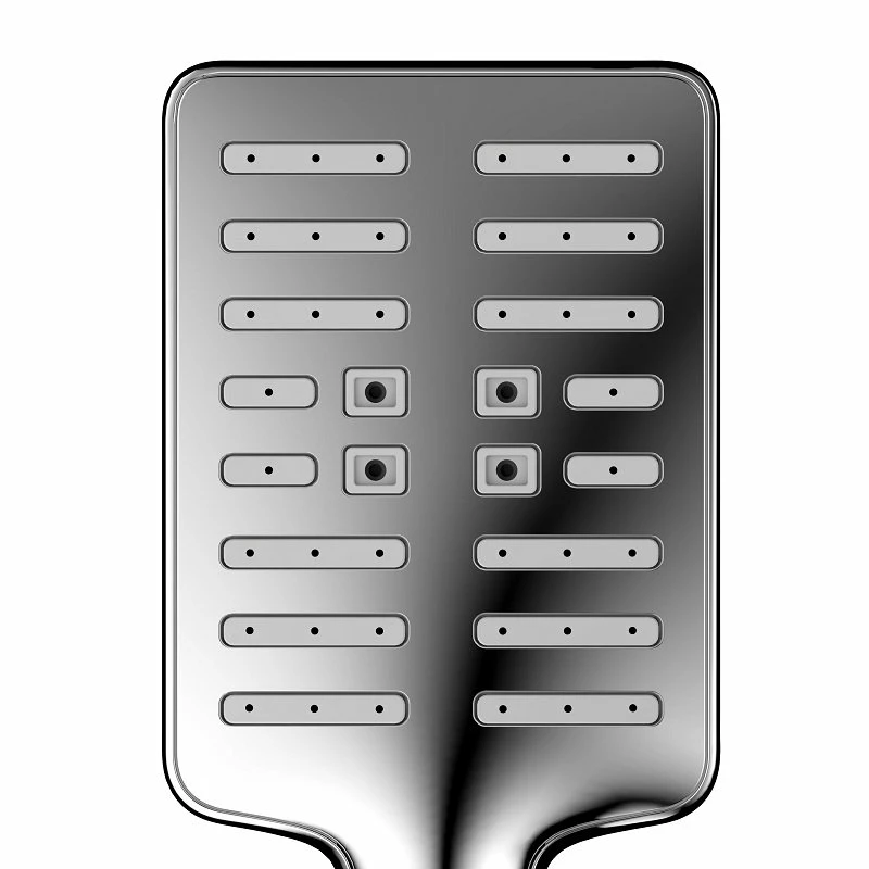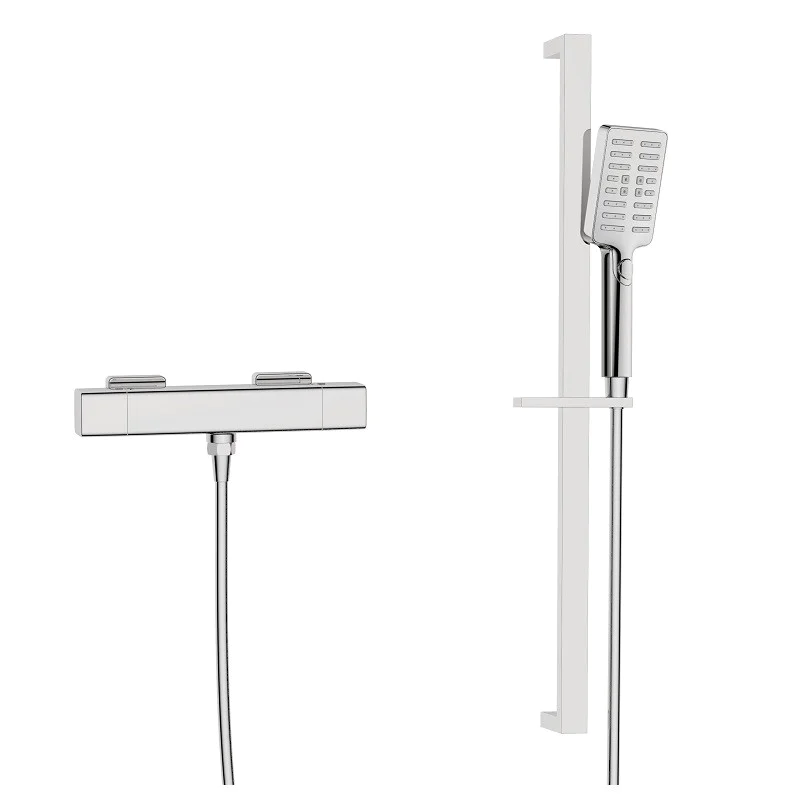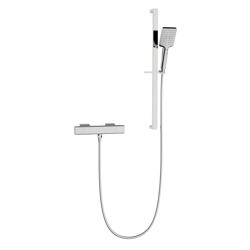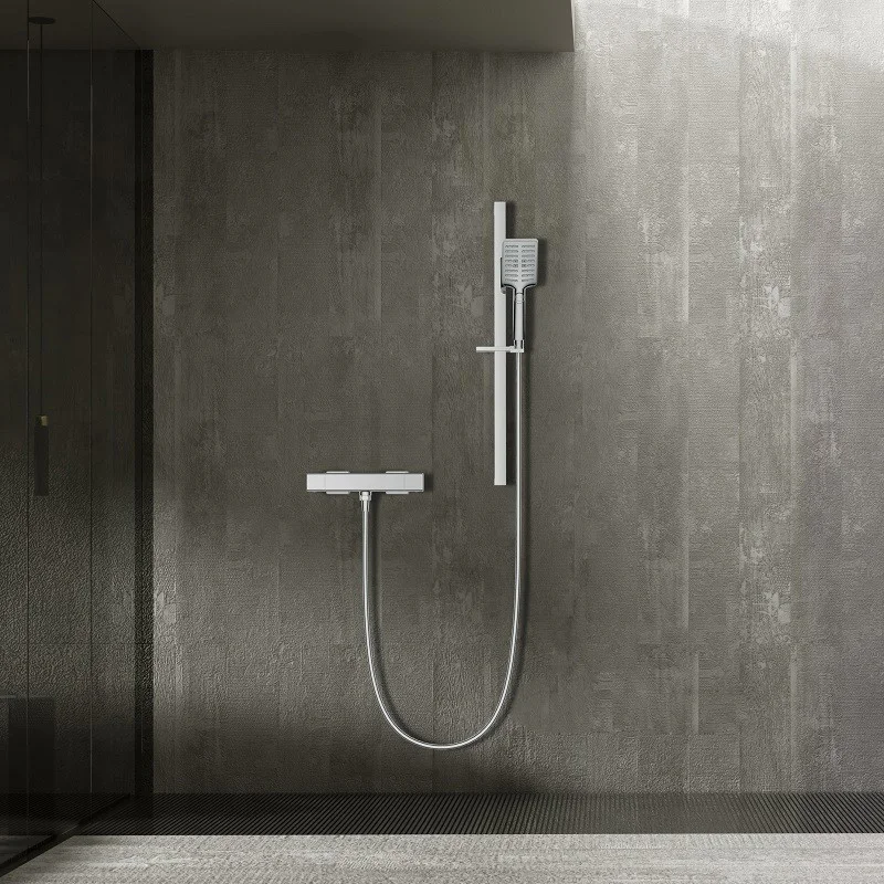 Le kit de douche avec mitigeur thermostatique Quadra est un modÚle sophistiqué, avec ses courbes carrés.
