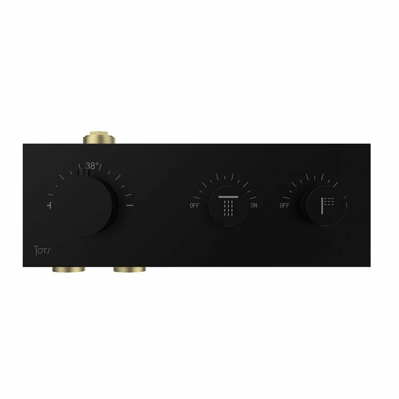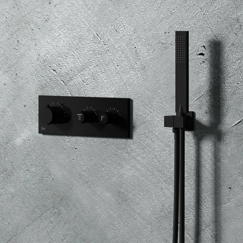Le mitigeur de douche encastrable noir en laiton est composĂ© de 3 boutons. Ils vous permettent d’activer la tĂȘte de douche et la douchette Ă main et de rĂ©gler la tempĂ©rature au degrĂ© prĂšs. Vous pouvez activer simultanĂ©ment les deux fonctions et ainsi profiter d’un confort unique.