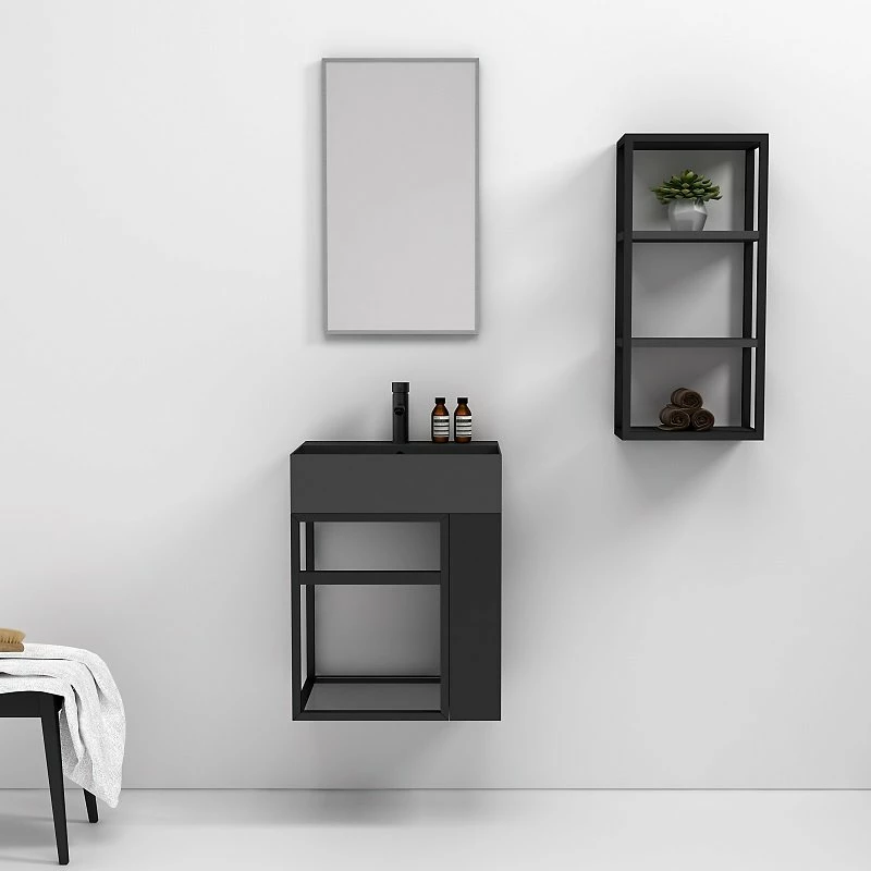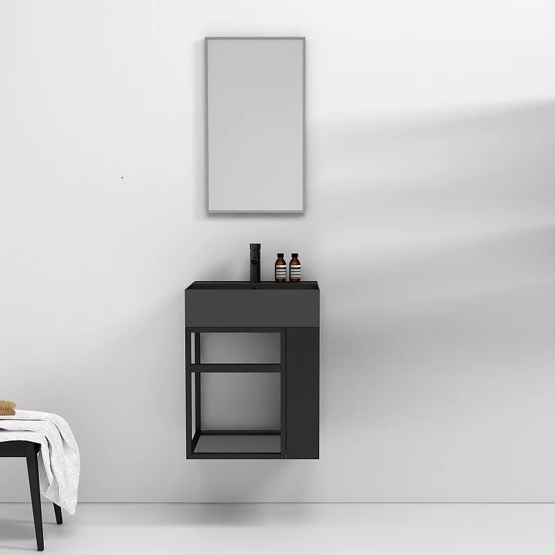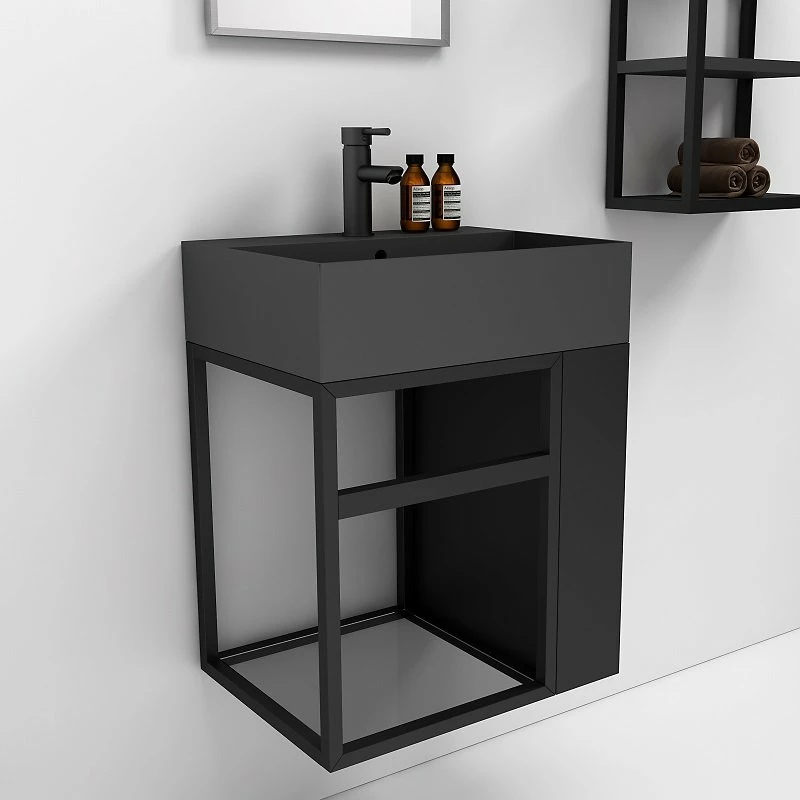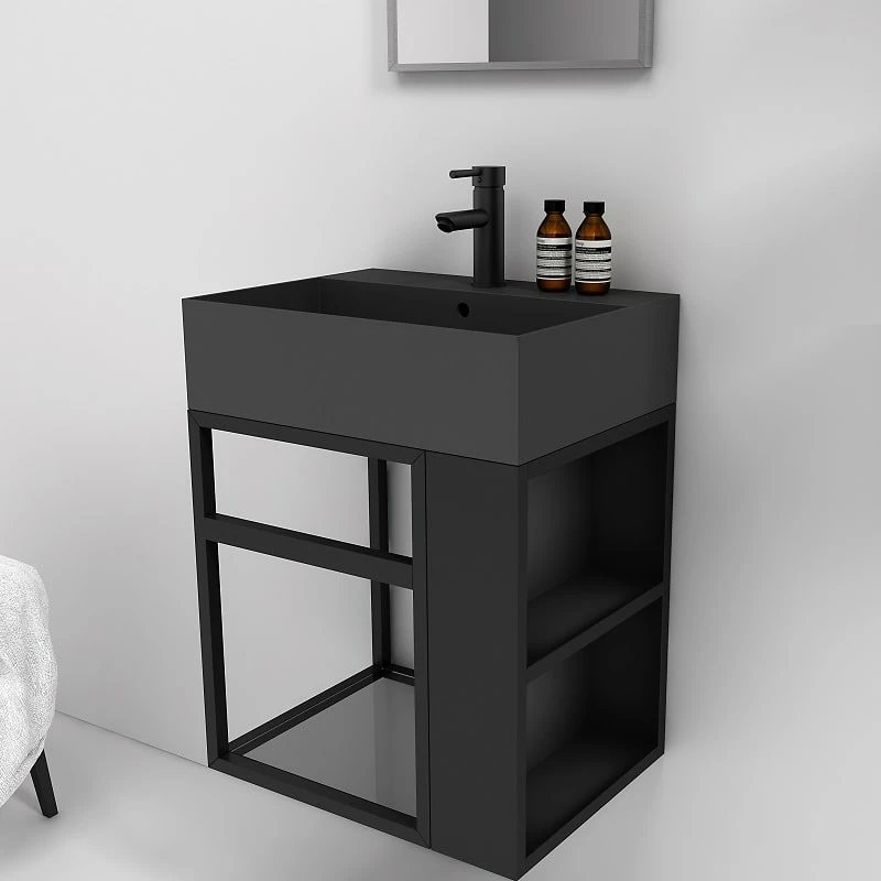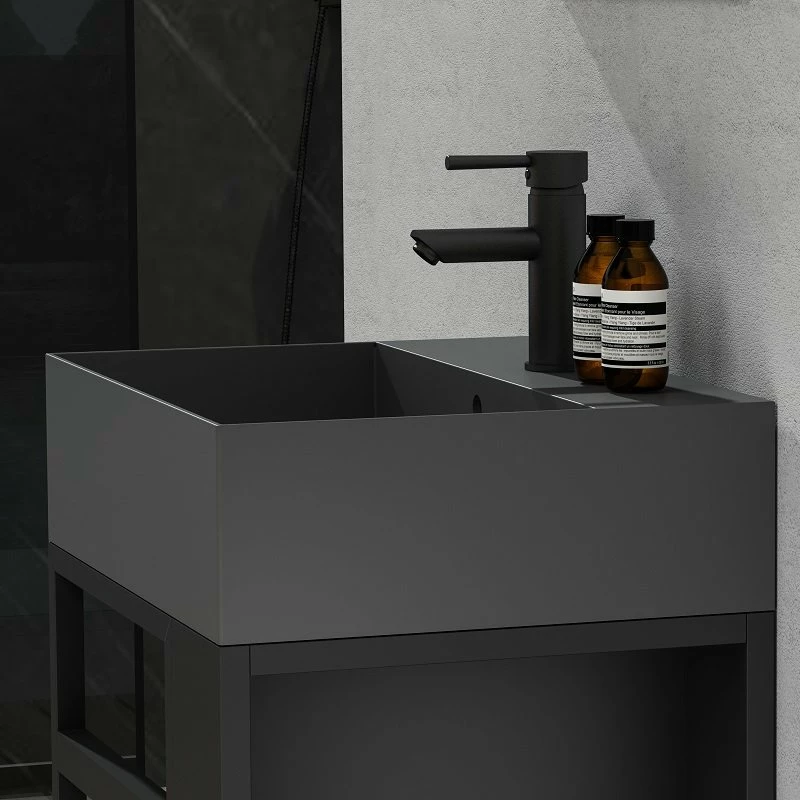 Sa structure métallique noire mate est agrémentée d’une vasque, rectangulaire avec trop-plein. Fabriquée à l’aide d’un mélange d’acrylique et de résine, la couleur gris foncé est incorporée dans la masse. Elle ne pourra pas s’écailler ou s’estomper dans le temps. Ce matériel haut de gamme, lui procure un toucher lisse, résistant aux chocs, aux rayures et aux UV, facile à entretenir, et hypoallergénique. Si par mégarde un choc la raye, sa surface est réparable par simple ponçage et polissage.