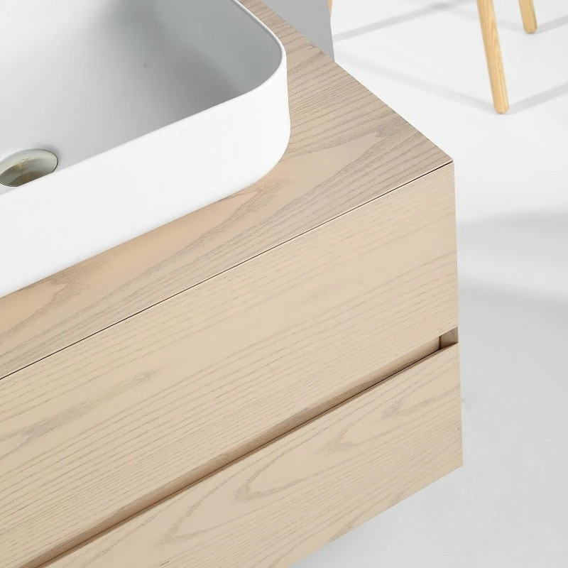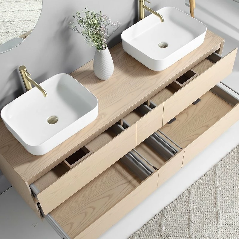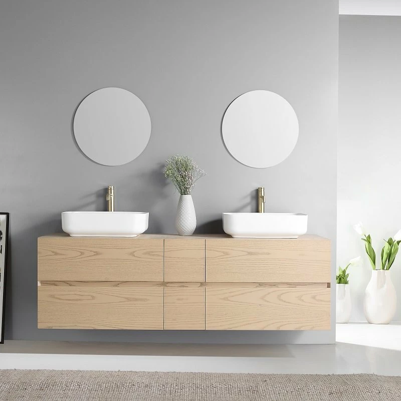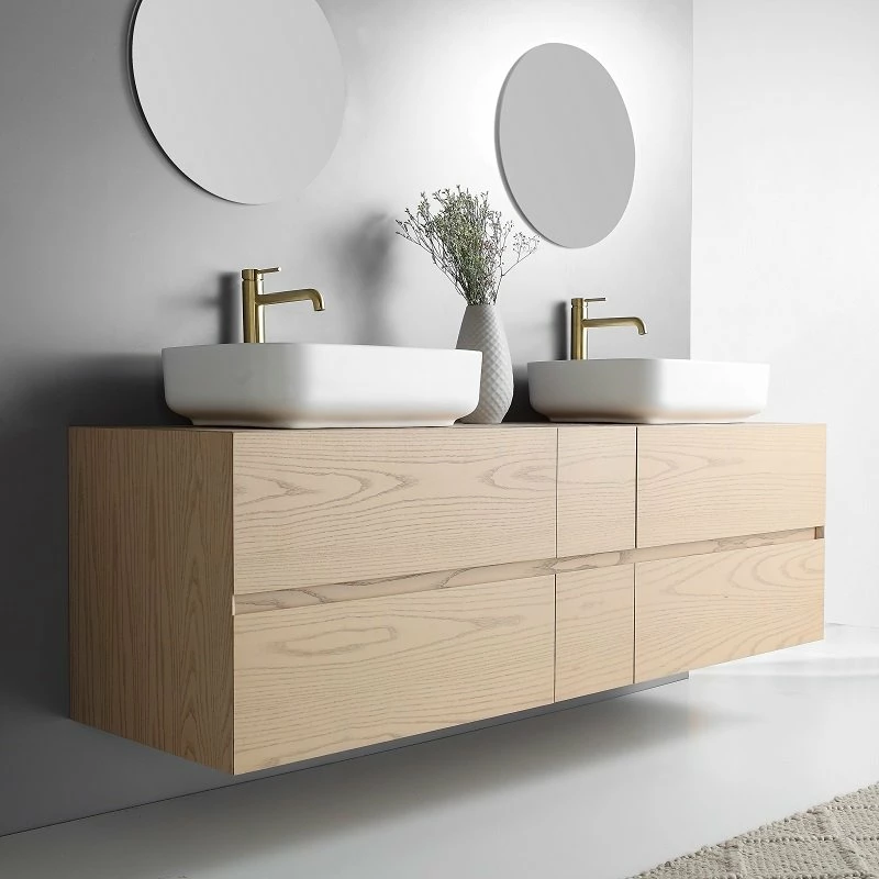 Vous pouvez installer des vasques à poser sur le meuble, nous proposons une large gamme sur notre site internet. Le meuble n’est pas percé pour laisser le choix entre un robinet surélevé ou un mitigeur mural.