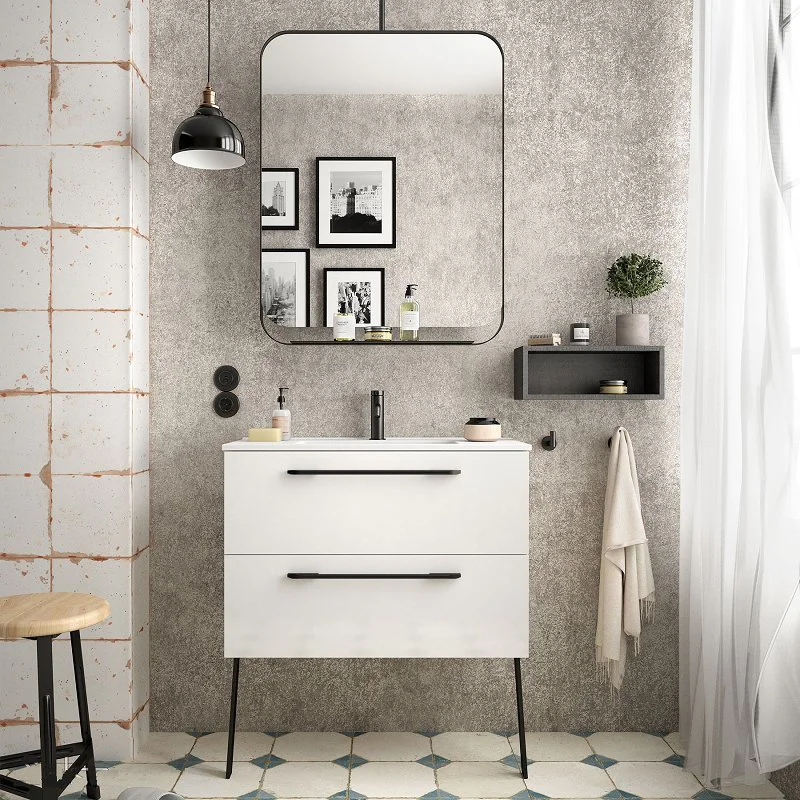 Ce meuble de salle de bain compact se décline en deux coloris: blanc brillant ou aspect chêne. Ils disposent d’un jeu de deux pieds noir mat et de poignées noir mat. La vasque est en porcelaine blanche brillante. Très tendance, le noir mat est de plus en plus présent dans le monde du sanitaire. N’hésitez pas à associer le meuble à une robinetterie noir mat.