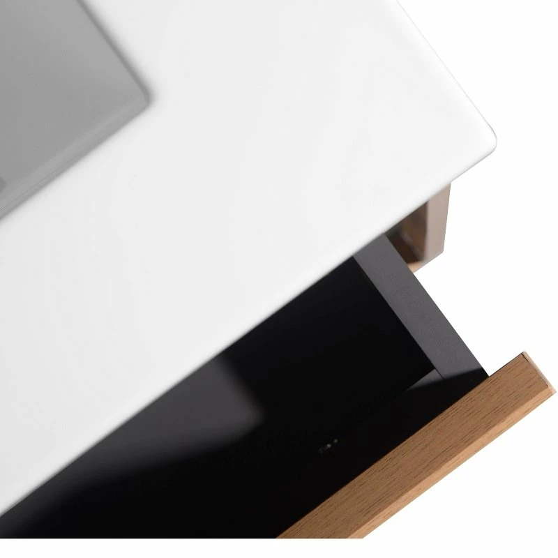 Ce meuble effet bois est doté d’assez de rangement, dont un grand tiroir avec un système soft close, c’est à dire que le tiroir s’ouvre et se referme d’un simple geste, tout en douceur et sans bruit. Ce système est très utile lorsque l’on a des enfants en bas âge. De plus, il est composé d’une niche de rangement ouverte.