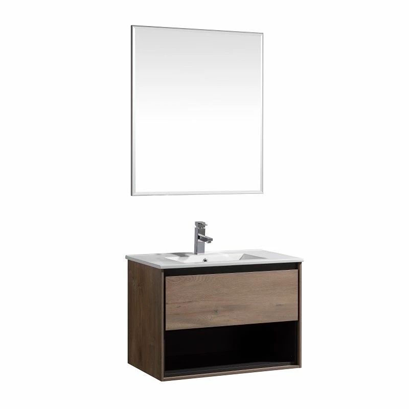 Cet ensemble de meuble de salle de bain waterproof est composé de deux éléments : une vasque en céramique blanche brillante avec trop-plein, un meuble bas de couleur bois chêne foncé avec sa niche ouverte.