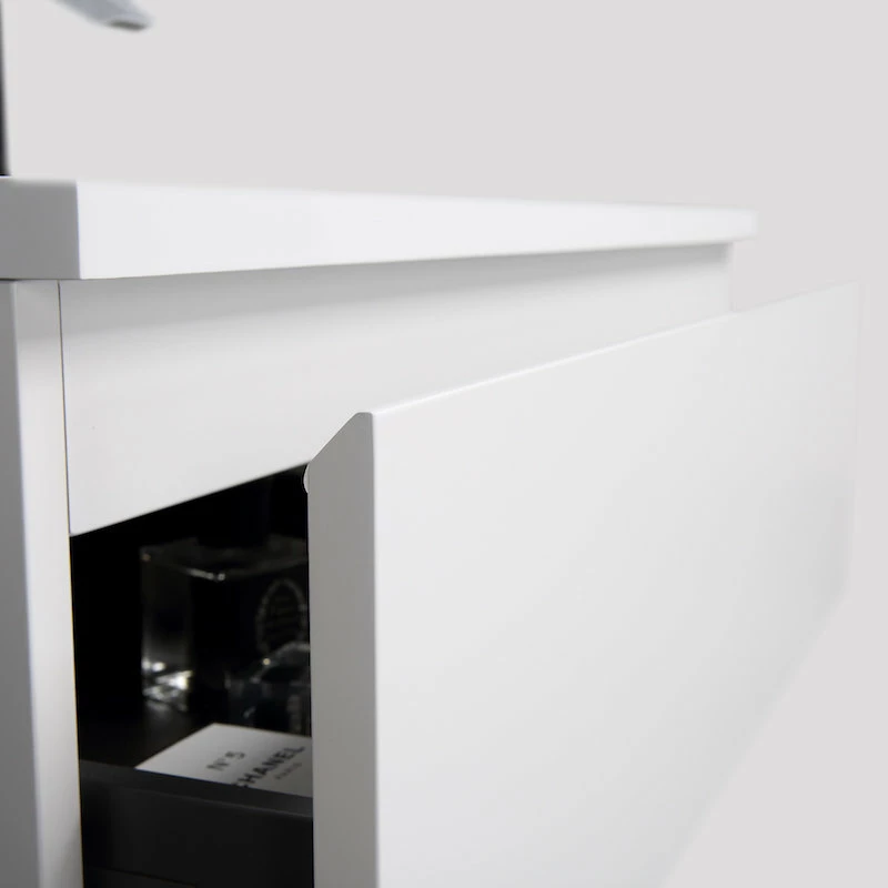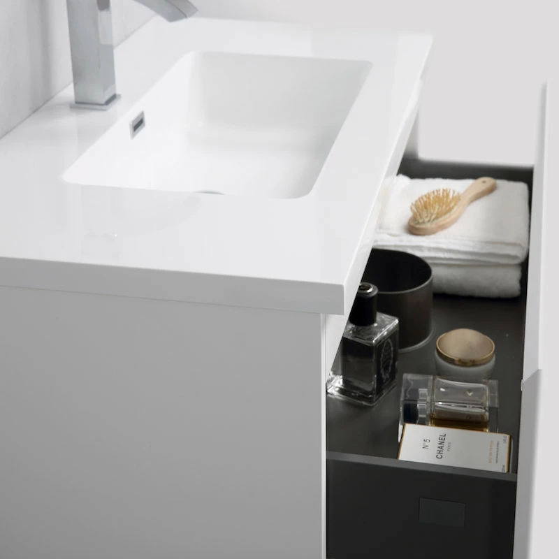 Avec ce meuble SHEDA 90 cm, vous trouverez une vasque encastrée en acrylique renforcé blanche ou noire.Celle-ci ne prend pas tout l’espace du plan de toilette et vous laisse ainsi de larges rebords pour y poser vos produits de beauté, un porte-savon ou même une petite décoration.