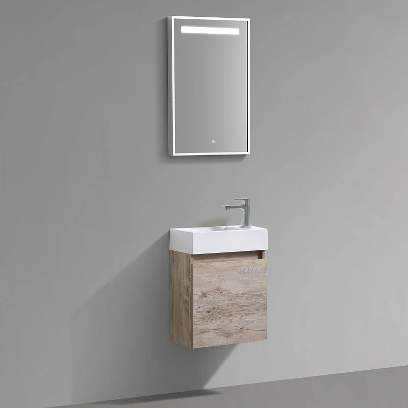 Ce meuble WC en MDF couleur bois chêne est composé dun meuble sous-vasque fabriqué en hydrofuge, matériau résistante à l’humidité. Ensuite, il est composé d’une vasque en résine, ce matériau est l’une des matières les plus répandues parce qu’il est résistant aux chocs et aux rayures.