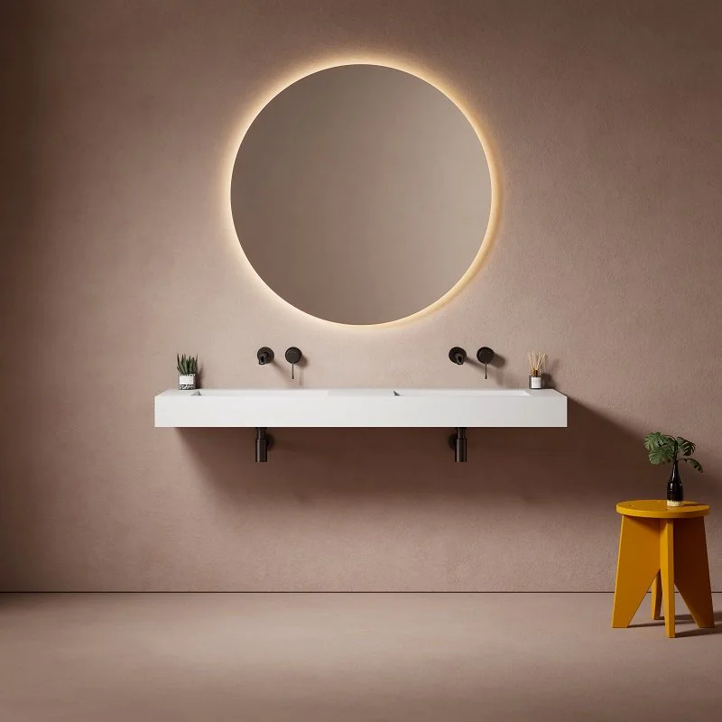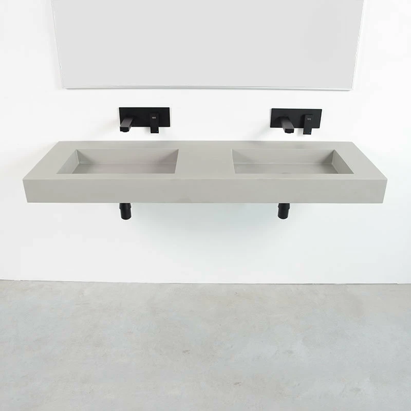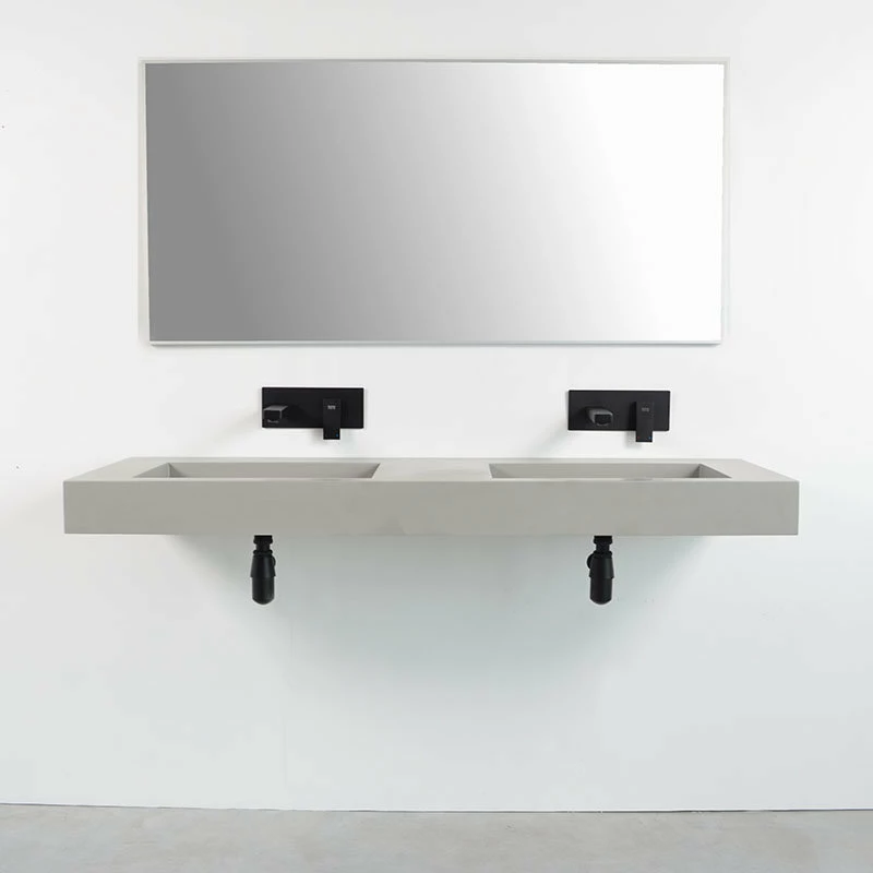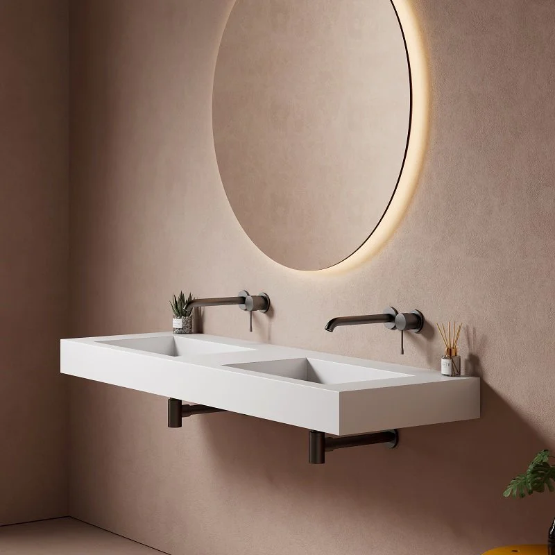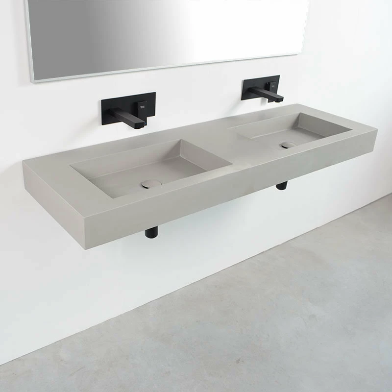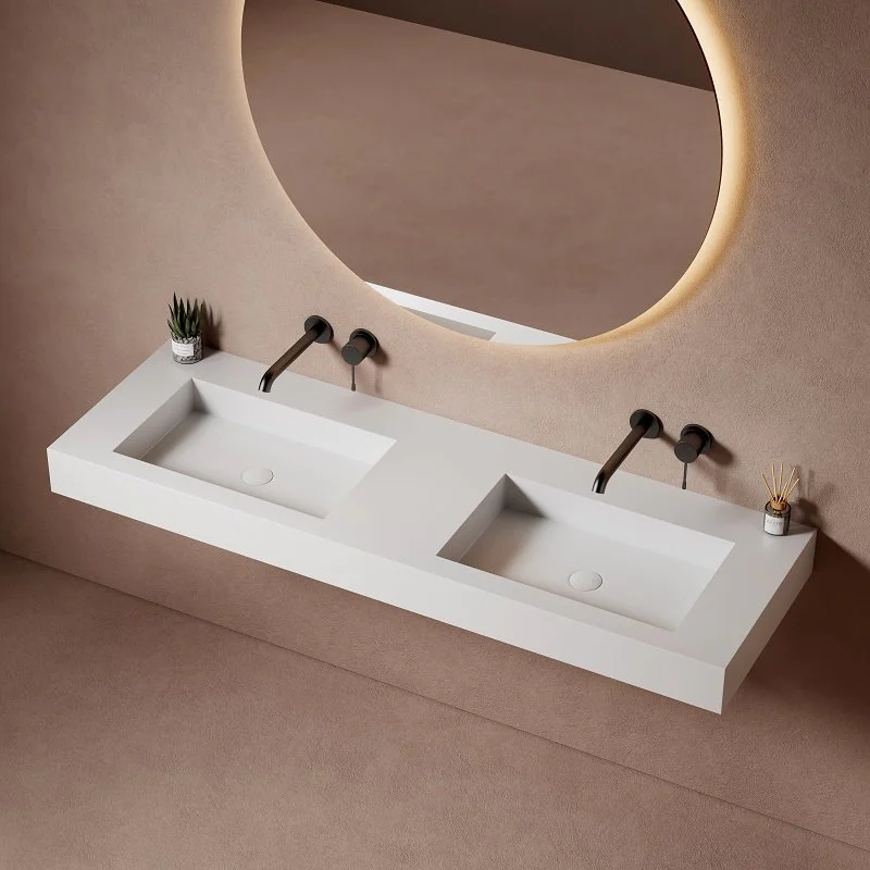 Cette double vasque existe en deux coloris : blanc mat, gris béton mat. La conception de ce plan vasque a été prévue pour vous laisser le choix de la robinetterie, encastrée dans le mur ou fixée sur le plan de toilette. Il vous suffit d’une scie cloche du même diamètre que votre robinet pour effectuer le percement, à l’emplacement qui vous convient le mieux sur le plan vasque.