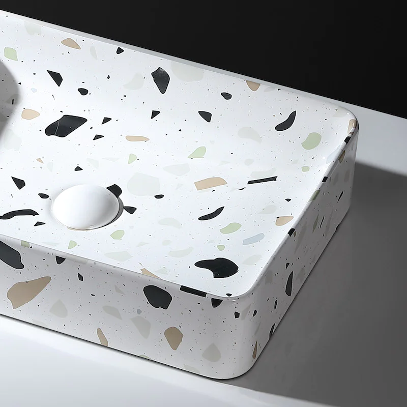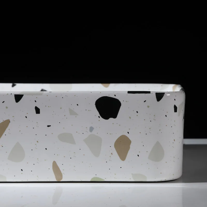 L’impression du motif terrazzo est aléatoire. Chaque vasque possède une sérigraphie différente et peut avoir plus ou moins de grains, placée à des endroits différents.