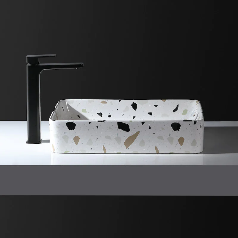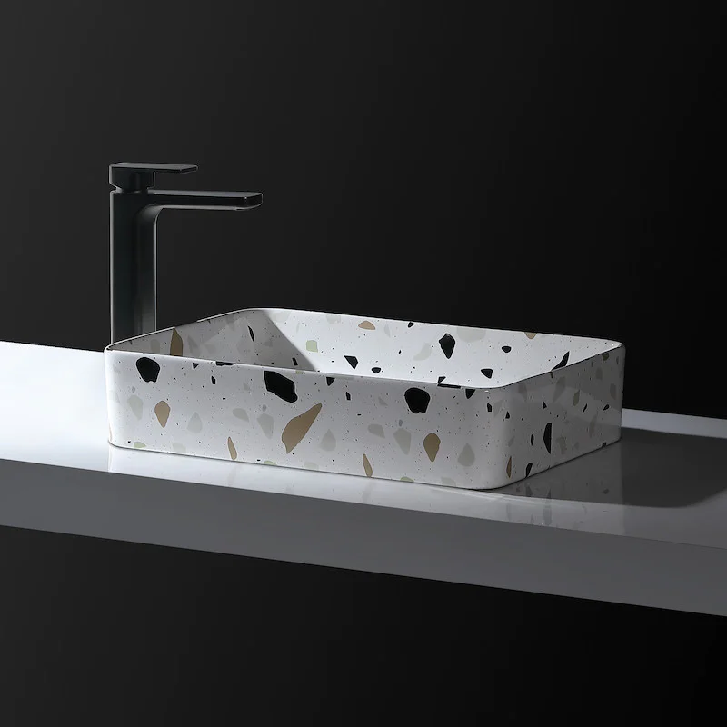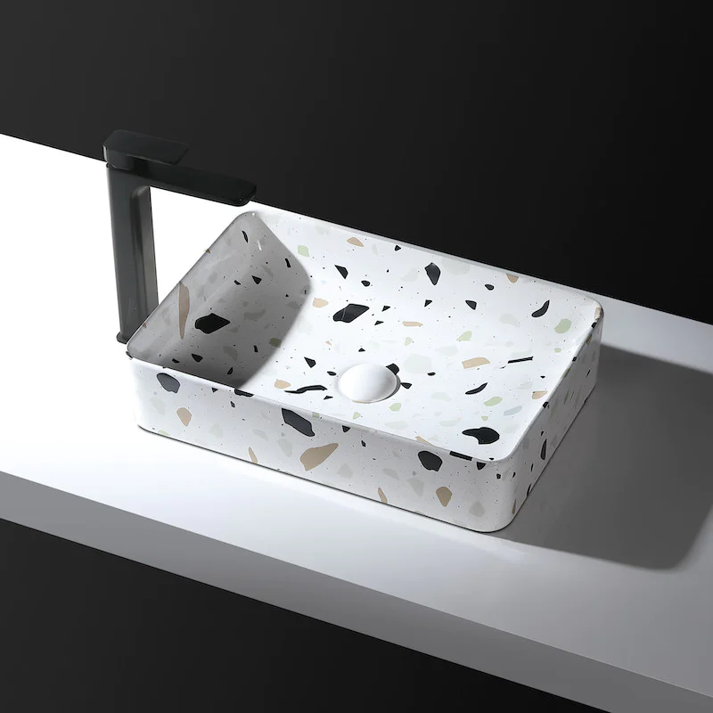 Vous aussi, tentez l’imprimé moucheté dans votre salle de bain grâce à cette vasque rectangulaire aspect terrazzo 50 cm Granum sans trop-plein.