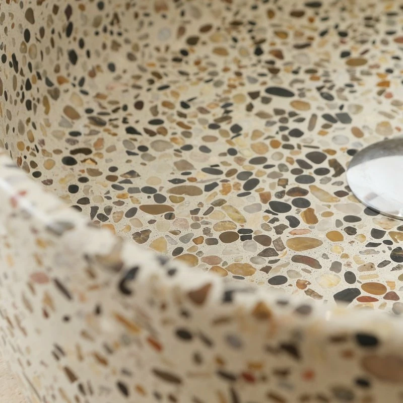Cette vasque en Terrazzo est très résistante à l’humidité, au choc et aux rayures. Contrairement à ce que l’on pourrait penser elle est parfaitement lisse et très facile à nettoyer.