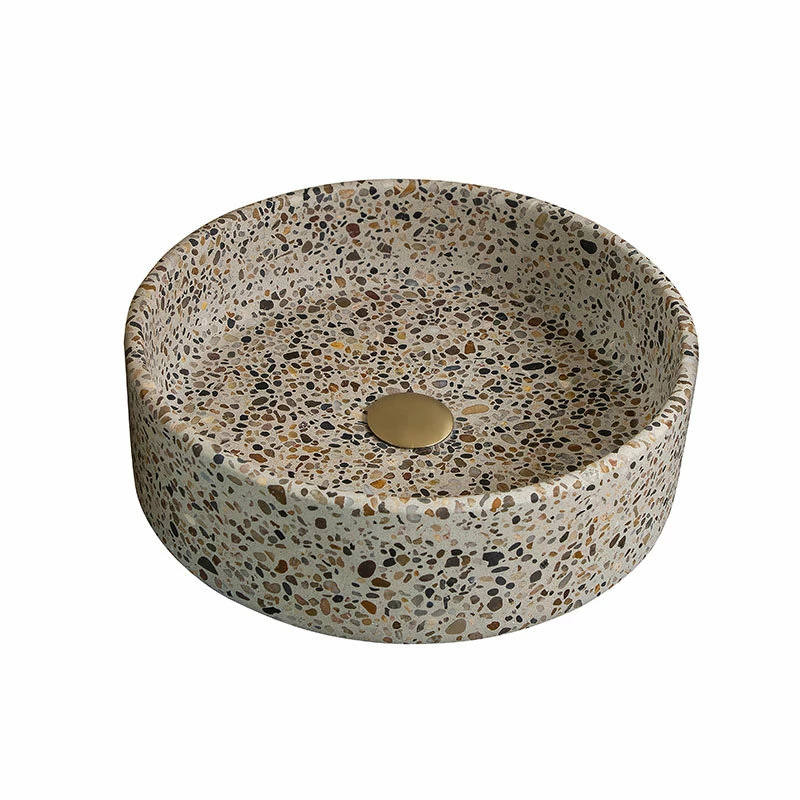 Cette vasque ronde de couleur marron est fabriquée en terrazzo, il se peut donc qu’elle ait quelques petites irrégularités, imperfections ou que la couleur varie légèrement d’une vasque à une autre. Cela n’affecte en rien l’utilisation de cette vasque, c’est au contraire ce qui fait le charme de ce matériau brut.