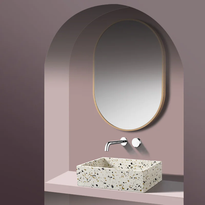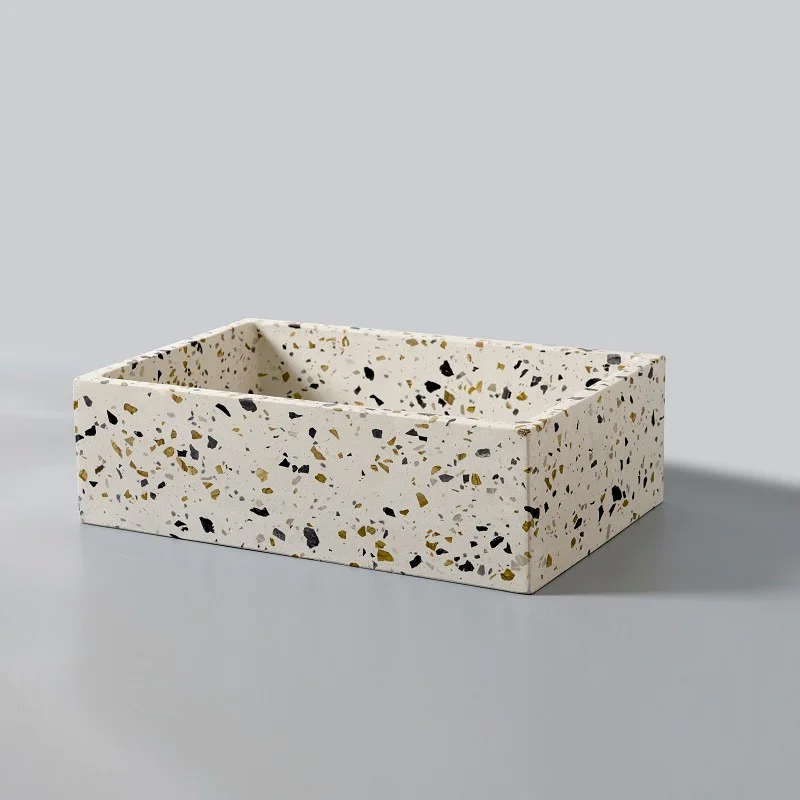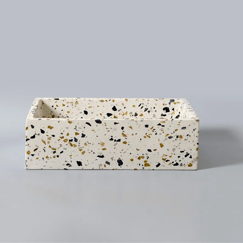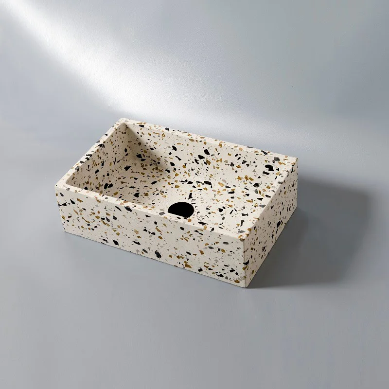 Laissez-vous séduire par cette vasque rectangulaire mouchetée multicolore en terrazzo aux grandes dimensions 50 cm x 31 cm.