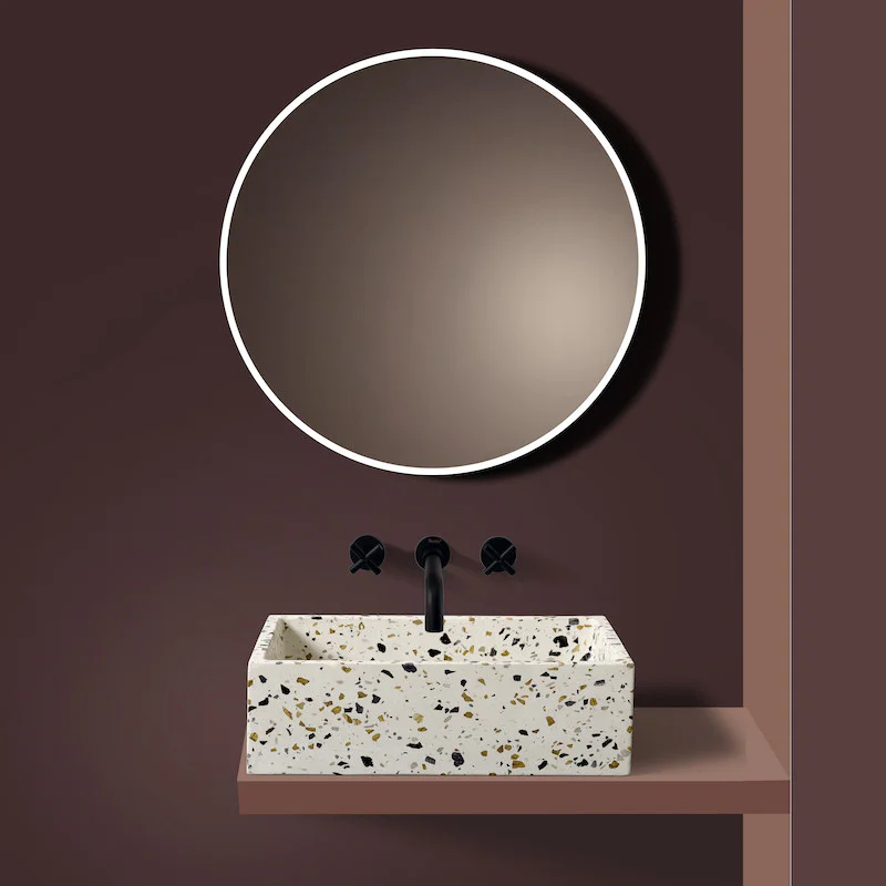 Ce qui fait l’originalitĂ© de cette vasque Ă poser en terrazzo est sa combinaison de couleurs. La base de la vasque est blanche, et les grains sont de couleurs jaune, beige et noir, de dimensions et de formes variĂ©es. Si vous rĂȘviez d’une vasque apportant de la couleur Ă votre salle de bain, ce lavabo evier en terrazzo serait parfait.